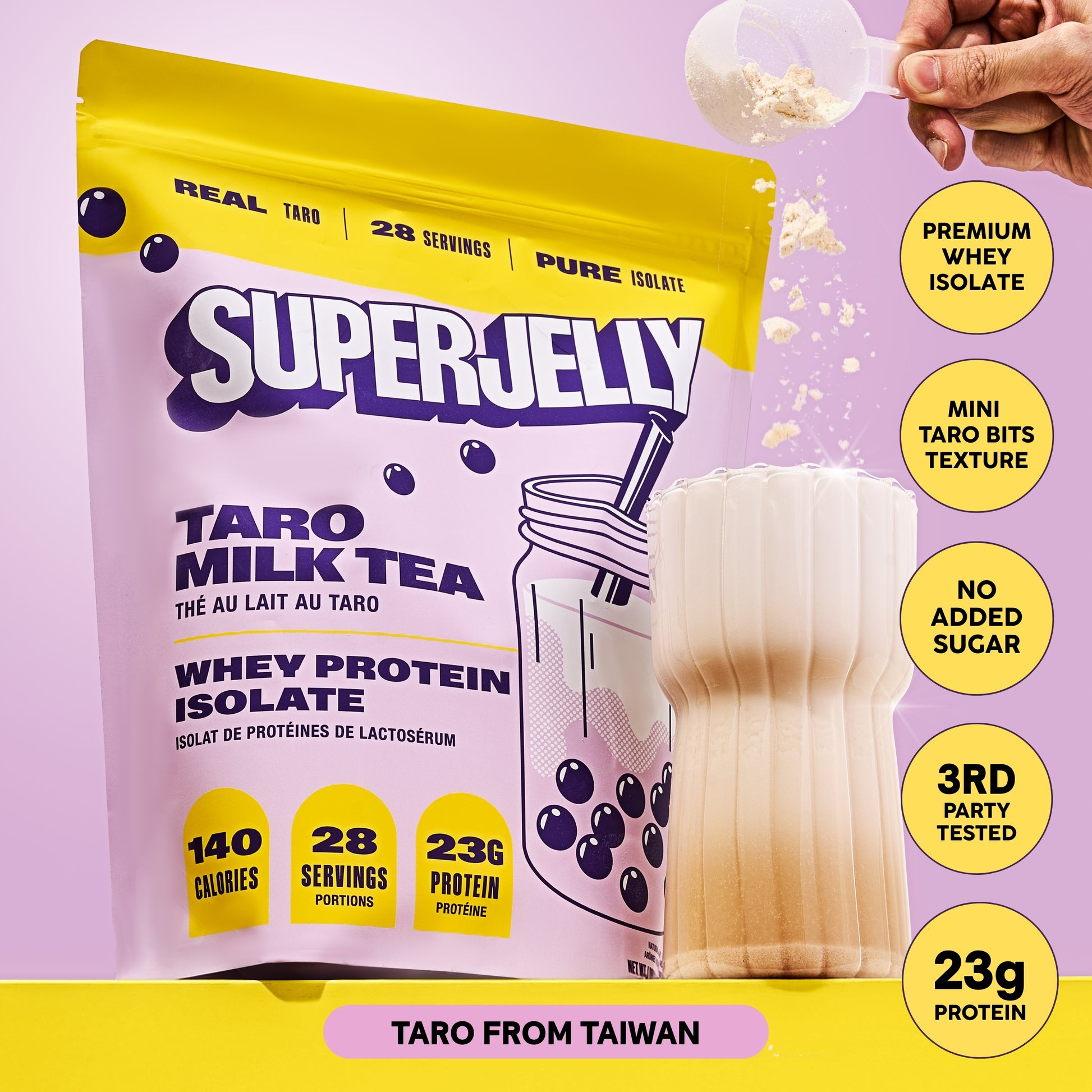 Creamy, nostalgic, and wildly addictive. Our taro whey isolate features a smooth milk tea base with mini taro bits for an intentionally textured finish, inspired by real taro desserts.